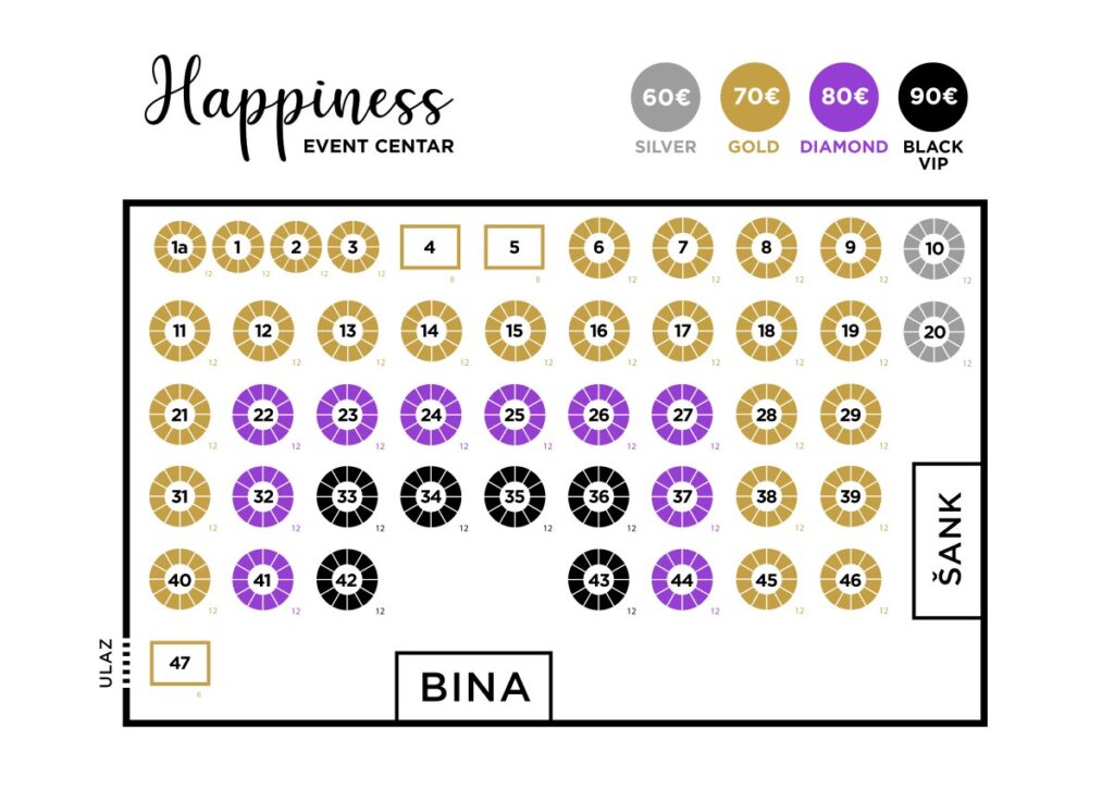*Napomena: Orijentaciona mapa prostora. U skladu sa novogodišnjom postavkom sale, moguća su manja odstupanja u rasporedu stolova.